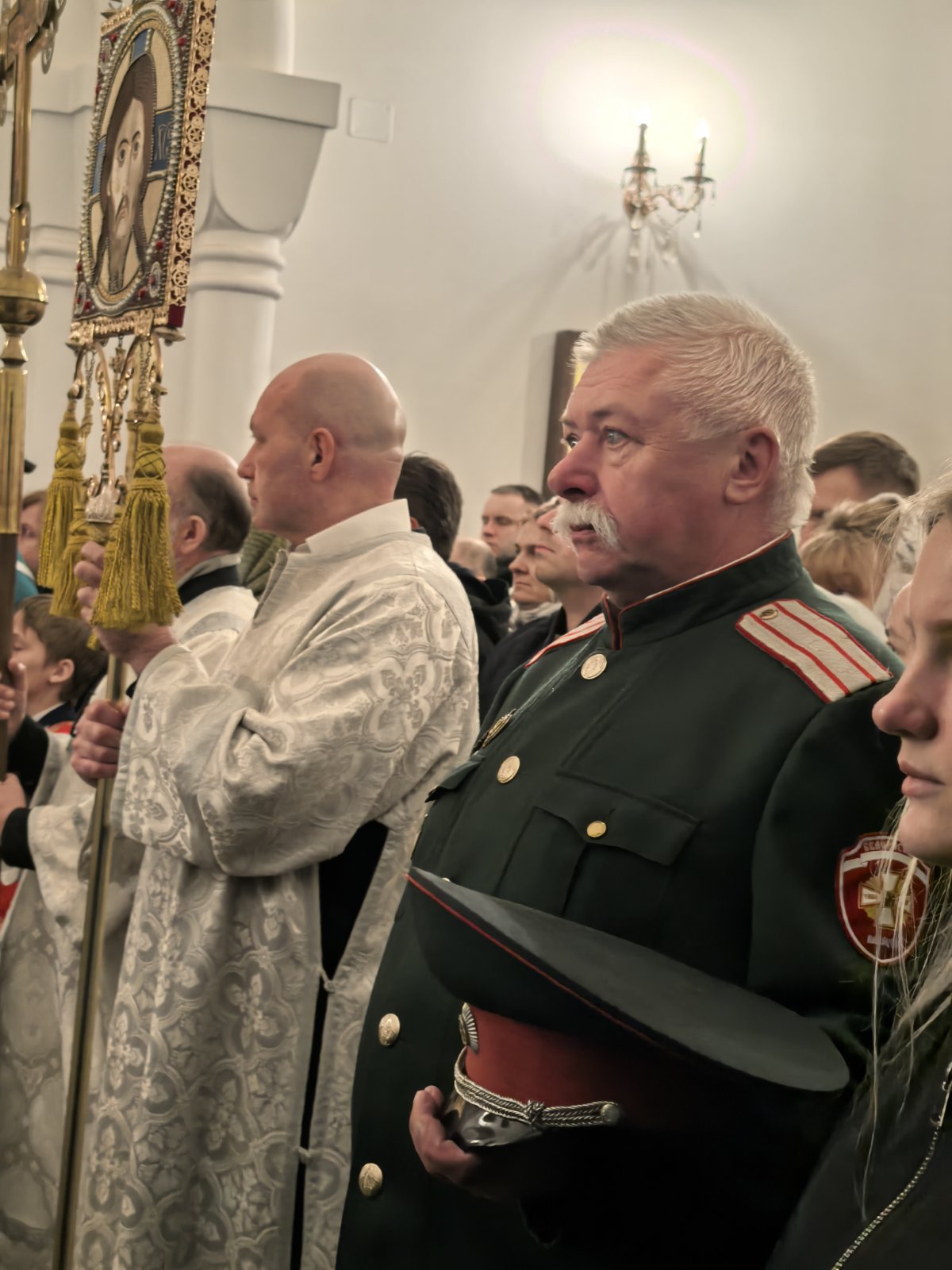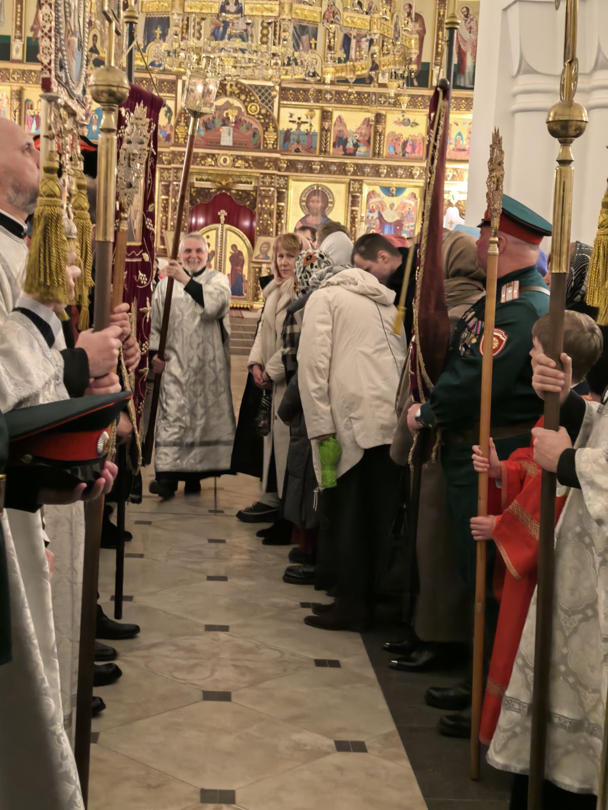 По приглашению отца-настоятеля казаки приняли участие в Пасхальном Крестном ходе, который всегда начинается в полночь. Это торжественное ночное шествие верующих вокруг храма, знаменующее радость Воскресения Христова и встречу с Ним, символически повторяющее путь жен-мироносиц к Гробу Господню, где двум казакам выпала высокая честь нести хоругви.